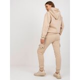 Beige women's tracksuit set with cargo pants. Product code: EMKMPL791.55Dominant pattern: plainStyle: Casualoccasion: casual, for a walk, for the city The model is wearing one size. Model's measurements: height 170 cm, bust 93 cm, waist 66 cm, hips 93 cm. Dimensions of the set in one size measured flat: width of the sweatshirt under the armpits 60 cm, sleeve length 60 cm, length of the sweatshirt 67 cm, width of the pants at the waist 35 cm, waist height 32 cm, length of the pants 98 cm.